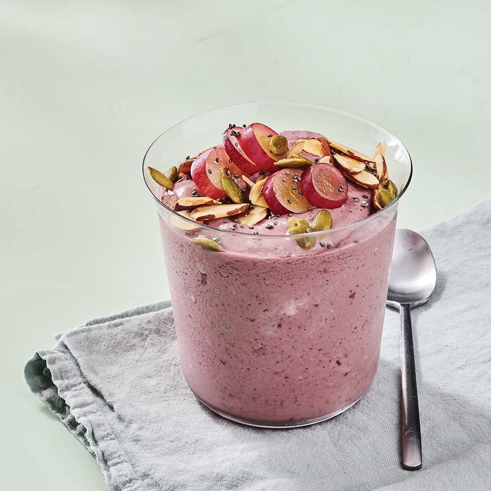 Pour into bowl and top with sliced grapes, sliced almonds, pepitas and chia seeds.